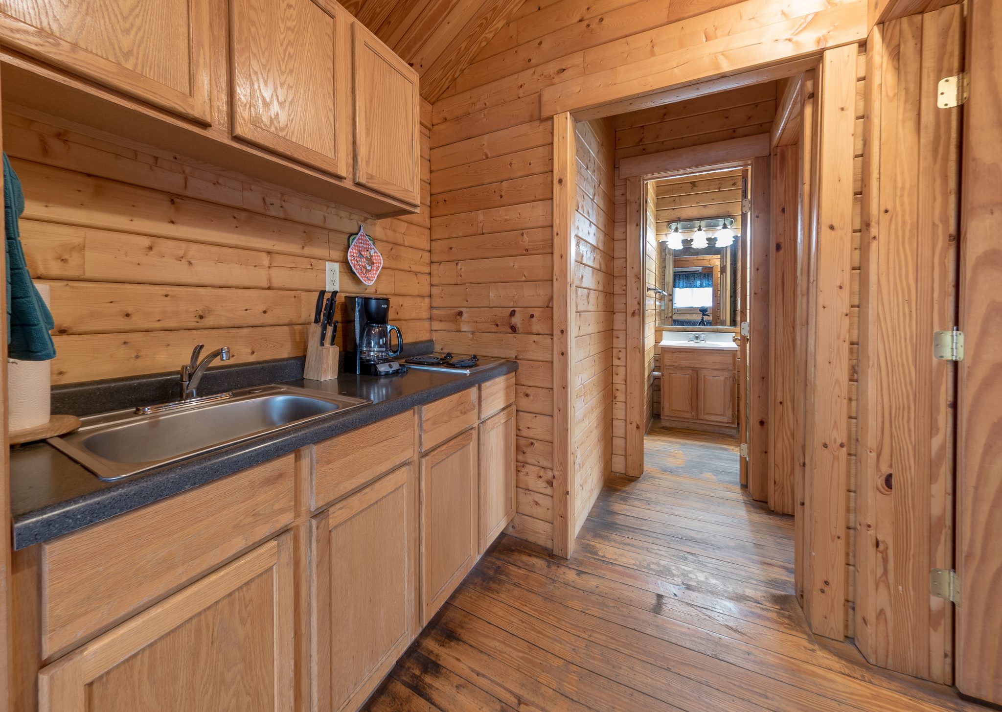 The Cindy Bear Cottage is perfect for the family that is looking for a full service getaway. Beds for 6, kitchenette stocked with cooking and eating utensils, 3 piece bathroom and a dining booth round out the features of this cabin. The cement patio out front provides an exceptional view of the park and surrounding landscape.